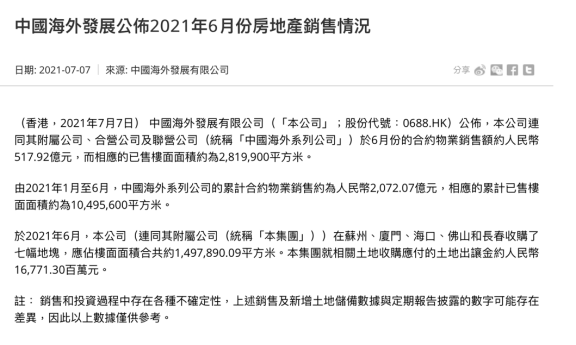 7月7日,中海地产发布2021年上半年销售简报。数据显示,2021年上半年,中海地产累计实现签约销售金额约2072.07亿元。累计签约销售建筑面积约1049.56万平方米。依旧保持稳健增长,全年4000亿销售在望。