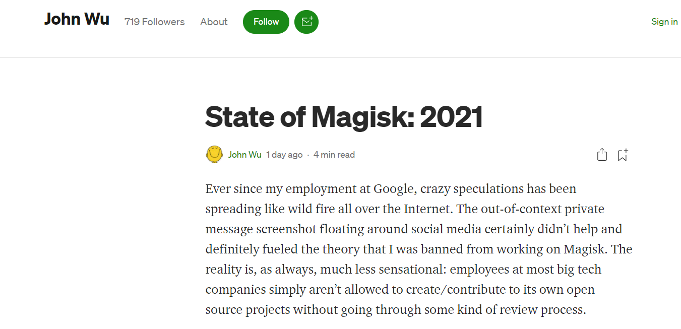 Magisk 项目将继续维护,也会参与社区工作,但他本人会受到谷歌的“额外审查”。
