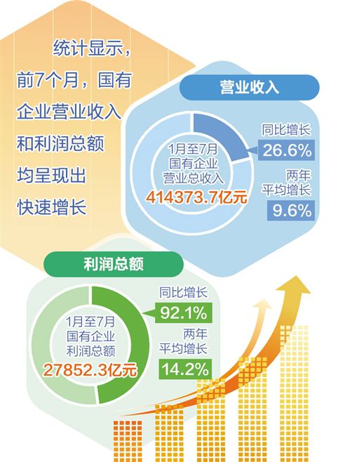 统计显示,前7个月,国有企业营业收入和利润总额均呈现出快速增长。在营业收入方面,1月至7月,国有企业营业总收入414373.7亿元,同比增长26.6%,两年平均增长9.6%。其中中央企业232755.9亿元,同比增长24.9%,两年平均增长8.0%;地方国有企业181617.8亿元,同比增长28.9%,两年平均增长11.8%。