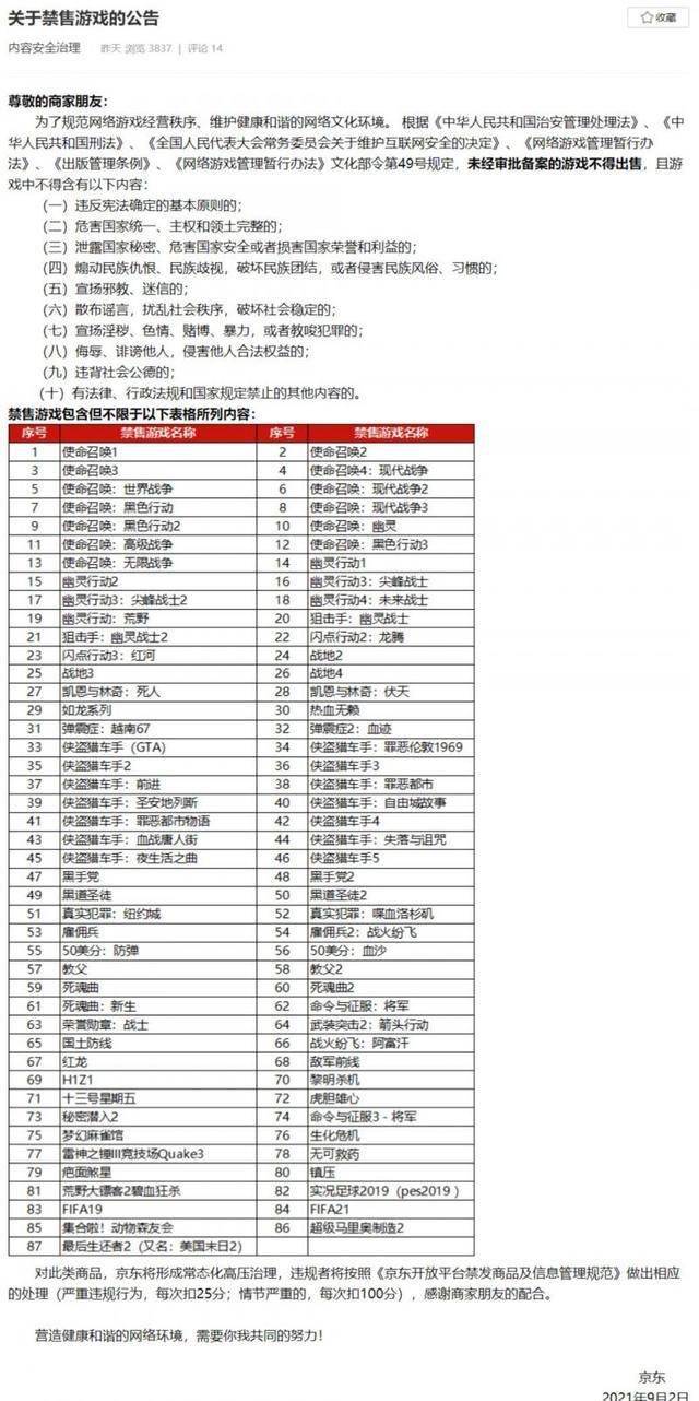 9月2日,京东发布关于禁售游戏的公告称,根据相关法律法规,未经审批备案的游戏不得在京东商城出售,并且对此类商品将形成常态化高压治理。