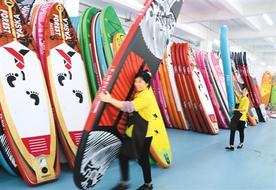 安徽省庐江县雅斯佳休闲用品有限公司致力于水上运动和休闲产业产品制造,年产各种规格的冲浪板10万只。公司多次参加国际运动及休闲产品展会,通过跨境电商,将产品销至全球50多个国家和地区。今年前8个月,已实现500万美元的出口额。图为员工正在检测即将出厂的冲浪板。