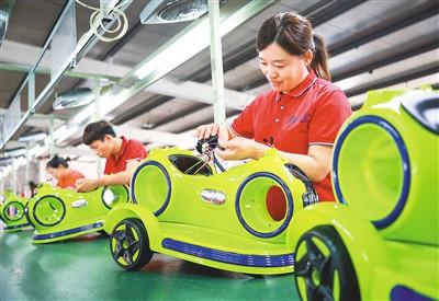 图为9月15日,河北省邢台市平乡县河古庙镇一家童车企业员工在加紧赶制一批出口订单。