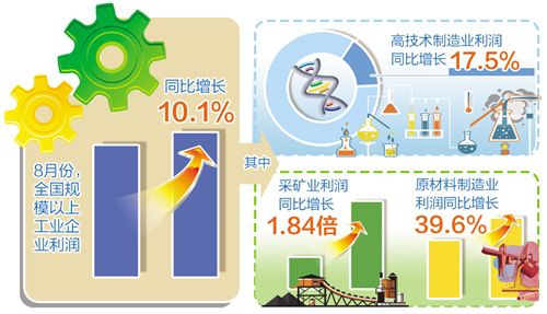 从1月份至8月份累计看,41个工业大类行业中,37个行业利润总额同比增长,1个行业扭亏为盈,1个行业持平,2个行业下降。其中,石油、煤炭及其他燃料加工业利润总额同比增长24.71倍,石油和天然气开采业增长2.65倍,有色金属冶炼和压延加工业增长1.78倍,黑色金属冶炼和压延加工业增长1.56倍,化学原料和化学制品制造业增长1.45倍,煤炭开采和洗选业增长1.45倍。