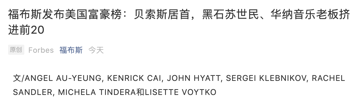 10 月 5 日消息 据福布斯官方公众号,今日,福布斯发布了最新美国富豪榜,前三名都是美国科技公司的创始人,分别为:杰夫・贝索斯、埃隆・马斯克、马克・扎克伯格。