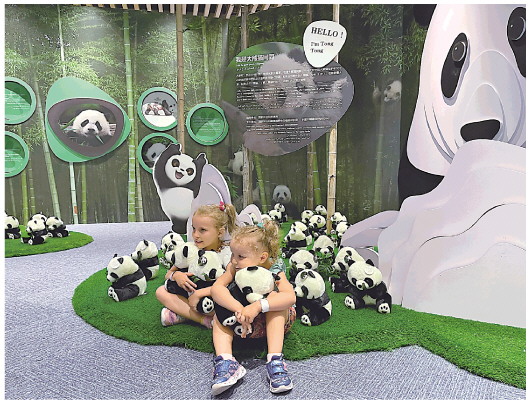 10月4日,在阿拉伯联合酋长国迪拜,两名儿童在迪拜世博会中国馆的大熊猫保护主题展厅里与熊猫玩偶合影。