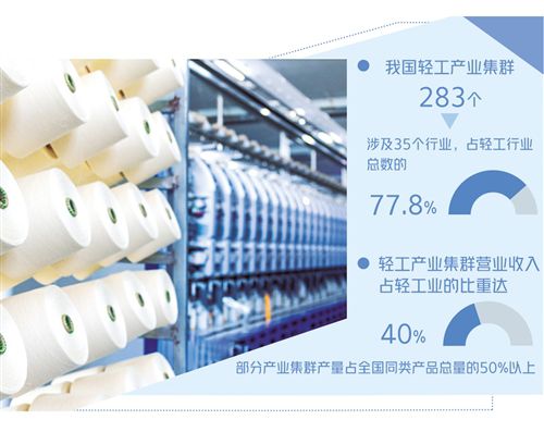 目前,我国轻工产业集群达到283个,涉及皮革、陶瓷、家电、塑料等35个行业,占轻工行业总数的77.8%。轻工产业集群营业收入占轻工业的比重达到40%,部分产业集群产量占全国同类产品总量的50%以上。