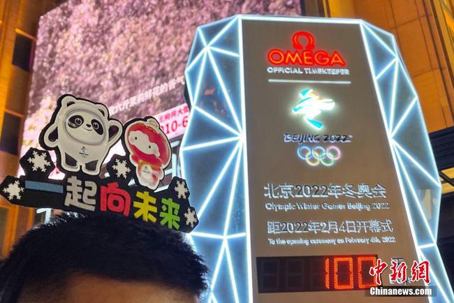 10月26日,北京王府井大街,北京2022冬奥会倒计时牌前,市民和游客在倒计时100天时记录留念。图片来源:视觉中国