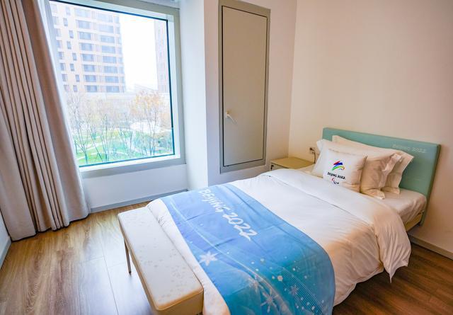 北京冬奥村的居住区公寓分为4个户型,135平方米、165平方米、190平方米、220平方米。房间干净整洁,天青色床头、白色墙壁、暖色窗帘、浅色复合木地板与深色家具的配合,看起来温馨雅致。
