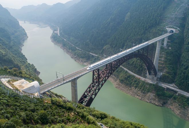 铁路穿越武陵山区,沿线地质条件复杂,全线的桥梁和隧道多达280座,其中桥梁162座57.8公里,隧道118座166.1公里,桥隧比达90.7%,是名副其实的“云端高铁”。乘车飞驰在一座接一座的桥梁上,俯看山河田野,赏心悦目。