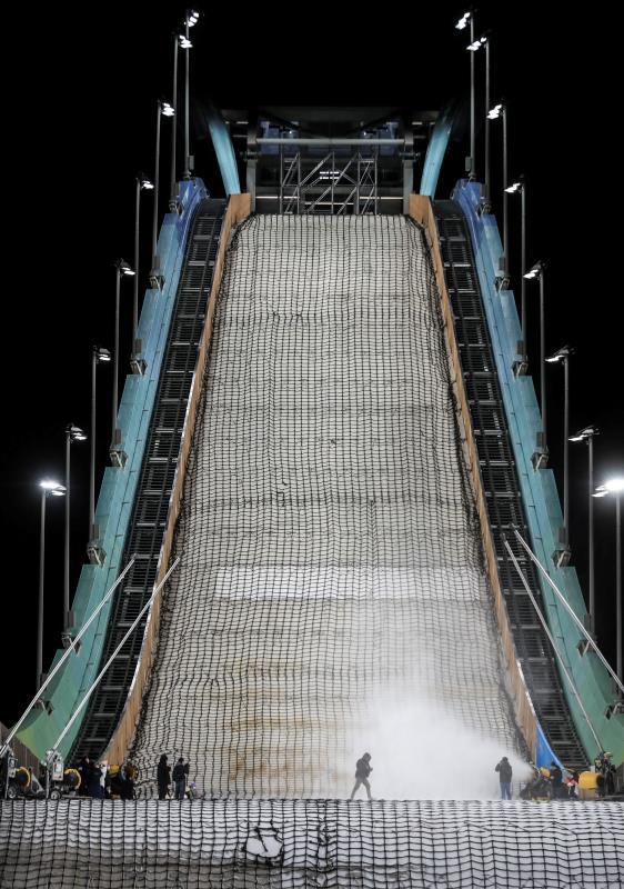 大跳台设计之初,赛道起点处就设置了卷扬系统和锚点,可将造雪设备运送至所需位置,同时压雪车也通过该系统一步步向上推行,将起跳区积雪推压至48米高位置。