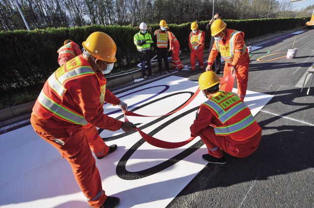 11月12日,奥林西路与科荟路交会路口,工作人员在路面上铺设奥运五环标识。新京报记者 王贵彬 摄