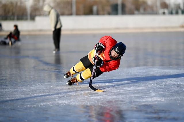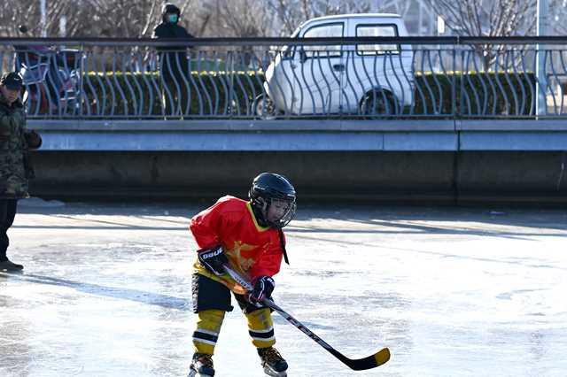 12月29日,北京奥林匹克森林公园,小朋友在冰面上打冰球。(中国日报记者 魏晓昊 摄)