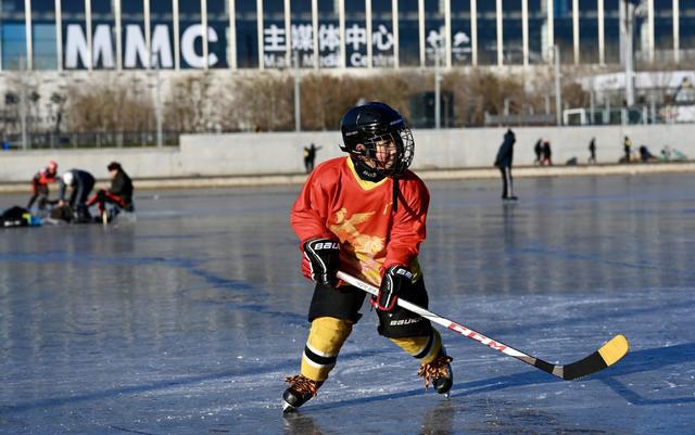 2021年12月29日,北京奥林匹克森林公园,市民前来滑冰、打冰球。随着2022年北京冬奥会临近,冰上运动升温,吸引群众体验