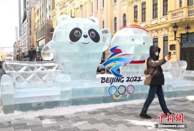 哈尔滨市道里区西九道街与中央大街交口,一座以2022年北京冬奥会吉祥物“冰墩墩”和冬残奥会吉祥物“雪容融”为主题的冰雕作品,吸引许多市民前来观看拍照。图片来源:ICphoto