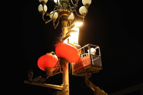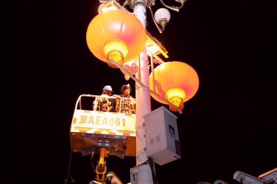 据介绍,长安街悬挂的灯笼直径1.2米,高度1.28米,重量达20多斤,中国结约30多斤,安装一个灯笼或者“中国结”需要4人合力完成,完成全套工序约需要30分钟。由于悬挂灯饰需要占道作业,为不影响长安街交通正常运转和市民出行,所有工作均在午夜12点以后开始,到凌晨5点前结束。