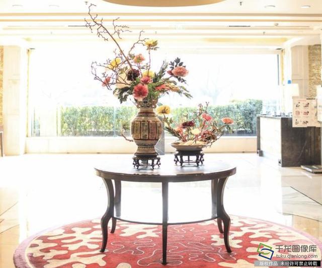 走进香格里拉饭店大堂,迎面就是一件高两三米、富丽端庄的中国式插花作品。花瓶是帝王黄青花龙纹瓶,花材中的迎客松表达了喜迎八方客的好客精神,竹子代表虚心有节的品格,牡丹则雍容华贵。整个作品把多种花材融为一体,彰显出中国传统插花的雍容华贵。