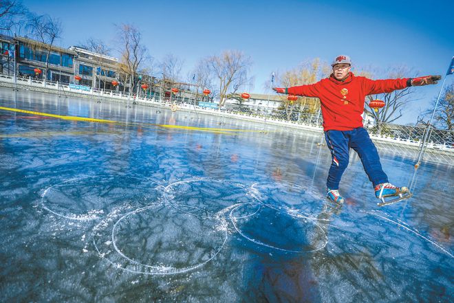 右脚画一个圈,左脚紧接着又画一个圈。如此反复五下,一个冰上五环,转瞬之间在什刹海冰场上被绘制出来。这是胡长立的冰上“绝活儿”,也是他对北京2022年冬奥会独有的祝福。