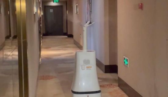 为了做好日常防疫,宾馆里邀来12台机器人科技防疫。其中,2台机器人是“代购”,将宾客们从酒店客服线上系统订购的餐食送至房间门口。每送完一次,工作人员会对机器人进行消毒,尤其是宾客触碰过的屏幕面板;10台机器人是“消杀工”,可根据设定的时间不间断对宾馆大堂、楼道进行喷雾消杀。