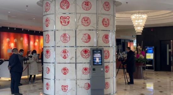 在北京金陵饭店,大门两侧的树木上挂满了红色“小老虎”玩偶,旋转门内“冰墩墩”“雪容融”舞蹈于柱形“福”字之上。大厅内的巨型柱子上贴满了形态各异的小老虎剪纸。走进房间,“冰墩墩”“雪容融”站在桌子上等候宾客的归来。