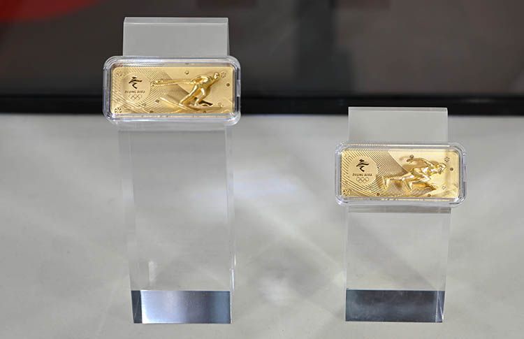 “冰雪竞技金条”包含冰上项目和雪上项目两枚足金金条,以短道速滑、越野滑雪,一冰一雪两款经典运动项目为核心素材进行设计。“冰雪竞技银条”包含15项冰雪运动造型设计,完美体现了北京2022年冬奥会竞赛项目的全部15个分项。图为:“冰雪竞技金条”。