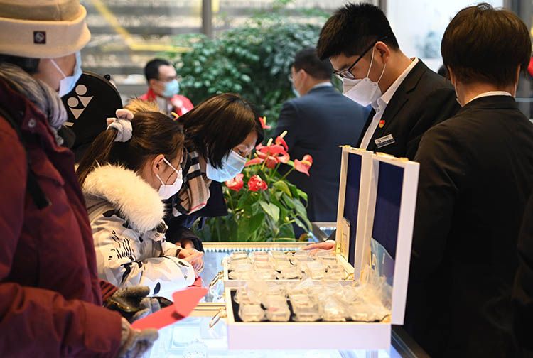 市民仔细观看“冰雪竞技金条”和“冰雪竞技银条”套装。