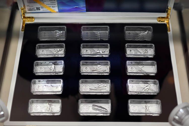 1月22日,北京2022年冬奥会特许商品“冰雪竞技金条”和“冰雪竞技银条”套装发布。“冰雪竞技金银条”以立体雕刻的方式呈现运动项目,通过高难度的工艺定格了运动员拼搏的瞬间,让人们可从不同角度观赏冬季运动项目的精彩时刻,具有很高的艺术观赏性。图为:“冰雪竞技银条”套装。