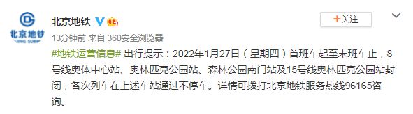 出行提示:2022年1月27日(星期四)首班车起至末班车止,8号线奥体中心站、奥林匹克公园站、森林公园南门站及15号线奥林匹克公园站封闭,各次列车在上述车站通过不停车。详情可拨打北京地铁服务热线96165咨询。