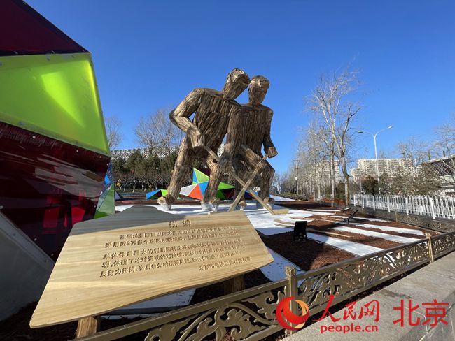海淀区园林绿化局副局长张雅菊介绍,这座名为《拼搏》的主题地景雕塑以努力拼搏的冰球运动员为主景,高6米,采用了2万多个废旧木块组成,总用量约总用材量约12立方米,是国内单体体量最大的利用园林废弃物等材料拼接而成的冬奥雕塑景观。