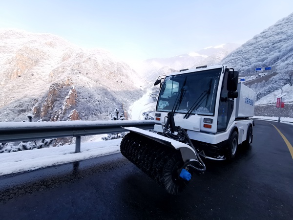 遇大雪时,车辆前端可装配推雪板,能迅速将道路上的积雪推至路边,清除道路主干线上的积雪,打通主干线,快速恢复交通。同时自动避让装置可最大限度保护道路上的各种设施。遇小雪时,车辆前端可选装快速滚刷,迅速将路面积雪打散,保证道路交通畅通。