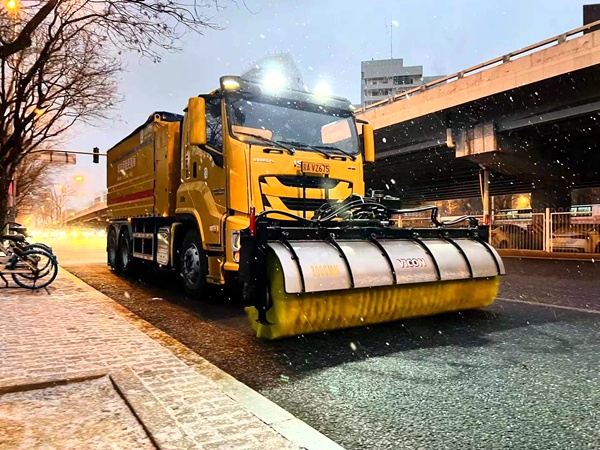 在极寒天气下,降雪前,该车可开启后撒布装置,对危险路段进行预撒布融雪剂,防止路面结冰;在雪中,可以利用前置滚刷进行扫雪,并同时利用可调节角度的吹雪嘴进行吹雪;在积雪较厚和路面结冰的路况下,可利用前置推雪铲推雪作业;雪后可利用扫雪装置进行清扫,边线路牙区域可利用吹雪装置进行吹雪。