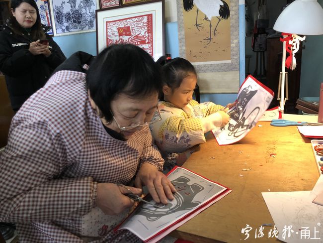已有20多年剪纸经验的胡玉飞老人是位民间剪纸艺术家,她的剪纸作品已成为当地的一张艺术名片,每当国内外客人来傅家路村参观,这些剪纸作品总能吸引游客的目光,并作为双方友情的礼赠之物。为了提升剪纸技艺,她学国画,学农民画,自画图案剪精品,近年来,《金牛送莲(颂莲)》《清洁河道》《众志成城战疫情》《党的光辉历程》等多幅剪纸作品在各类民间剪纸比赛中获奖,不少作品还入选宁波市优秀农民画剪纸展览。因名声在外,前来拜师学艺的孩子们也多了,胡玉飞都热心接待。