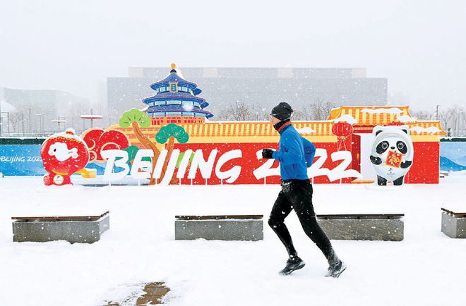 昨天,一名男子在北京2022年冬奥会和冬残奥会主媒体中心外的区域冒雪跑步。新华社记者 武巍摄