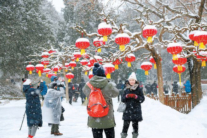 昨天,市民在景山公园欣赏雪景,在皑皑白雪的映衬下,一只只红灯笼化身“雪容融”。 本报记者 安旭东摄