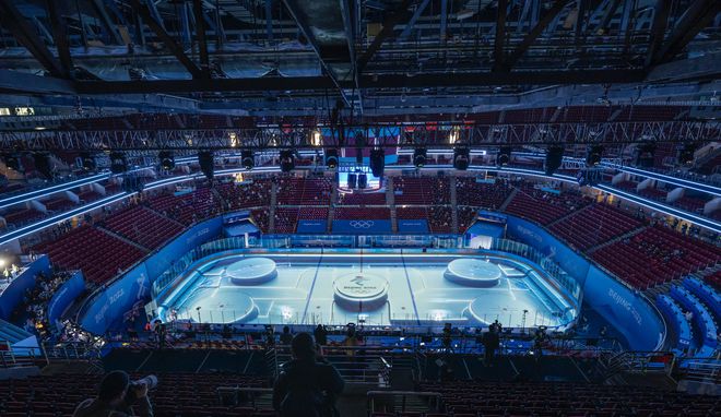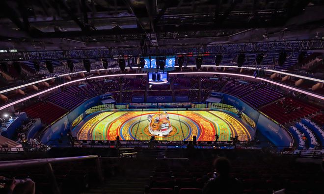 五棵松体育中心赛前冰面投影。新京报记者 陶冉 摄