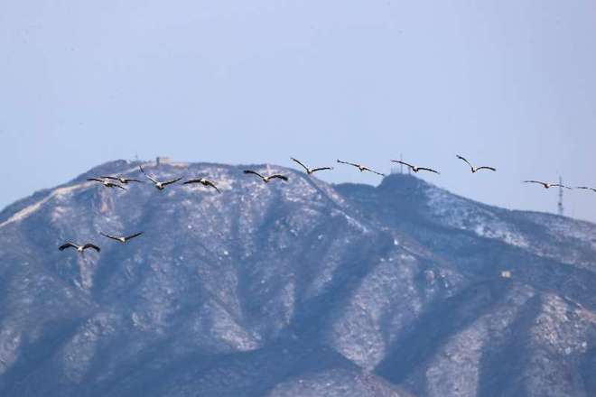 2月18日中午,黑豹野生动物保护站的队员在八达岭长城上空相继监测到两群以灰鹤为主迁徙归来的候鸟,往它们熟悉的官厅水库栖息地降落。灰鹤类候鸟较为健壮,飞行速度较快,一般情况下,要比其他雁鸭类候鸟提前到达北京。