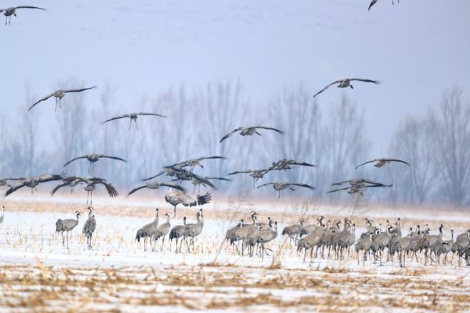 留在当地越冬的和迁徙回来降落的灰鹤。受访者供图