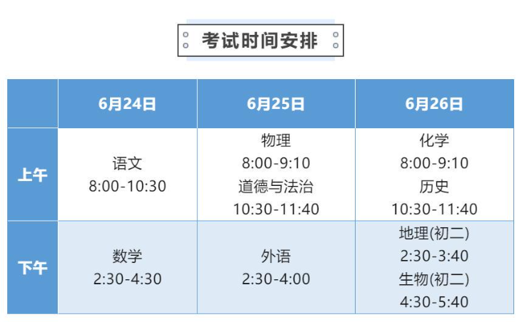 中招总分660分中,语文试卷总分值为100分,数学试卷总分值为100分,外语总分值为100分(卷面成绩60分,听力口语成绩40分),听力口语考试采取计算机考试方式,与统考笔试分离,有两次考试机会。物理(含开放性科学实践活动10分)、化学(含开放性科学实践活动10分)、生物(含开放性科学实践活动10分)、道德与法治(含综合社会实践活动10分)、历史(含综合社会实践活动10分)、地理(含综合社会实践活动10分)六门科目分值均为80分。初三年级文化课考试时间为6月24日至26日上午,初二年级文化课考试时间为6月26日下午。体育与健康科目满分40分,其中现场考试30分,过程性考核10分。