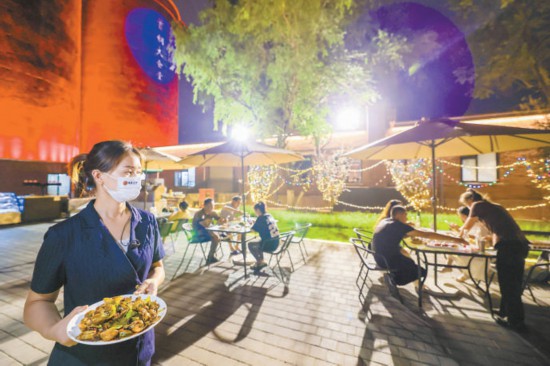 首钢大食堂背后的巨大筒仓被红色灯光照亮,游客在室外惬意就餐。本报记者 邓伟摄