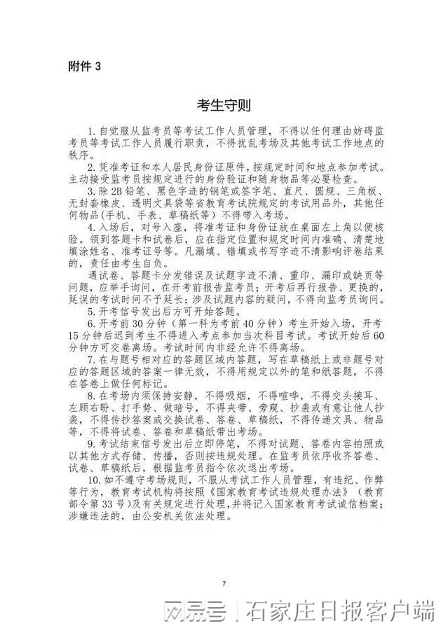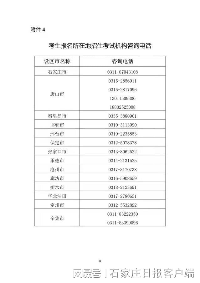 4.考试疫情防控措施将根据疫情变化适时调整,请考生关注中国运动文化教育网、河北省教育考试院网站、官微和当地招生考试机构发布的信息,主动了解考点及考点所在地疫情防控最新要求,及时了解相关政策信息。各市咨询电话见附件4。