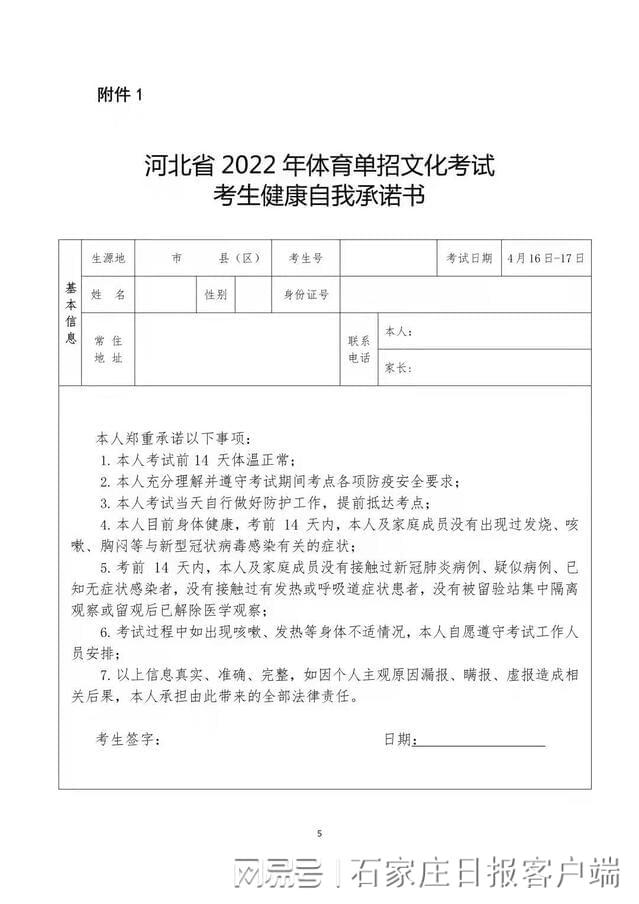 1.考生对所提供的“河北健康码”(含“通信大数据行程卡”)、核酸检测报告、《河北省2022年体育单招文化考试考生健康自我承诺书》等证明的真实性负责,因不实行为造成的后果自负。