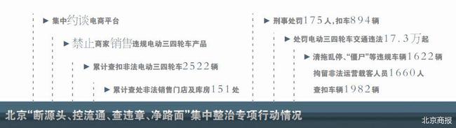自去年12月底以来,北京市公安局联合交通、商务、市场监管、城管执法等有关部门,启动了"断源头、控流通、查违章、净路面"集中整治专项行动,全力挤压涉电动三四轮车违法犯罪空间。包括集中约谈电商平台,禁止商家销售违规电动三四轮车产品,各进京检查站和乡村卡口,累计查扣非法电动三四轮车2522辆,累计查处非法销售门店及库房151处,刑事处罚175人,扣车894辆,非法运输销售行为基本"清零"等。