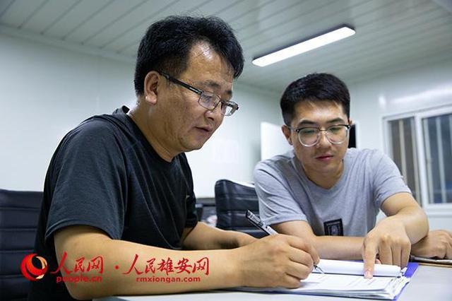王占忠(左)同容城县八于乡政府干部刘远加班工作。人民雄安网 宋烨文摄