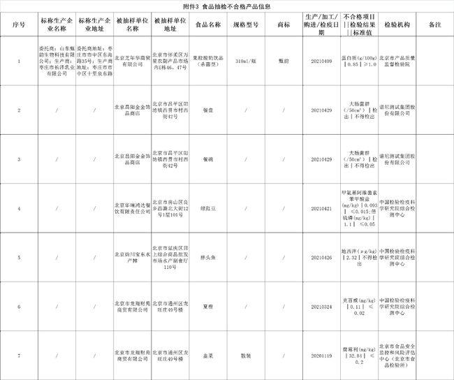 1.标称山东甄韵生物科技有限公司委托枣庄市长泽乳业有限公司生产,北京芝年华商贸有限公司经营的果粒酸奶饮品(杀菌型),蛋白质不符合产品明示标准。检验机构为北京市产品质量监督检验院。