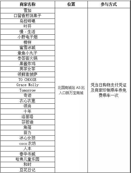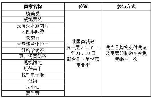 国庆期间(10月1日-10月7日),市民在地铁站内指定商铺购物,可凭当日纸质消费凭证,免费乘坐地铁一次。(从专用通道进入,乘车不限里程。出站时,请主动出示消费凭证,工作人员登记“已乘车”字样,即可出站。消费凭证仅限当日当次使用,逾期作废)。