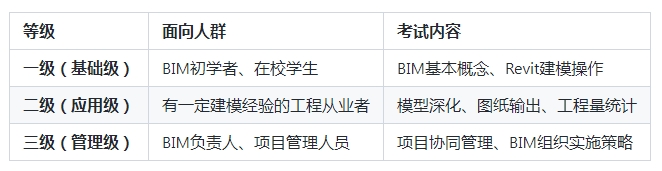 每个等级都有理论考试与实操考试部分,主要考查考生对BIM技术的理解、软件操作能力和实际应用水平。