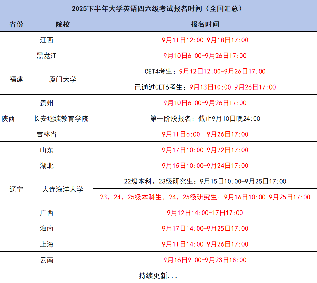 最近很多小伙伴在咨询“2025下半年英语四六级什么时候报名?”,英语四六级报名时间各省不同,为了帮助大家及时查看自己省,小编为大家整理如下: