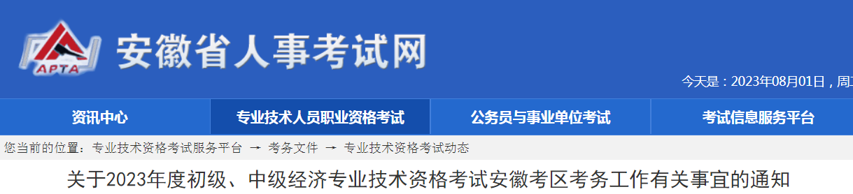关于2023年度初级、中级经济专业技术资格考试安徽考区考务工作有关事宜的通知