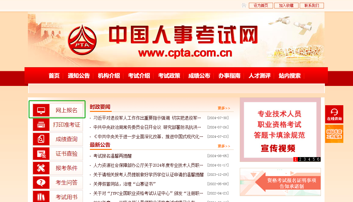 注册报名时间:截止8月22日17:00。报考者须在规定的时限内登录中国人事考试网(www.cpta.com.cn)“网上报名”栏目进行报名。首次登录全国专业技术人员资格考试报名服务平台的报考者须先进行网上注册,填报个人身份信息、上传经照片审核工具处理的本人半年内白底证件照片。