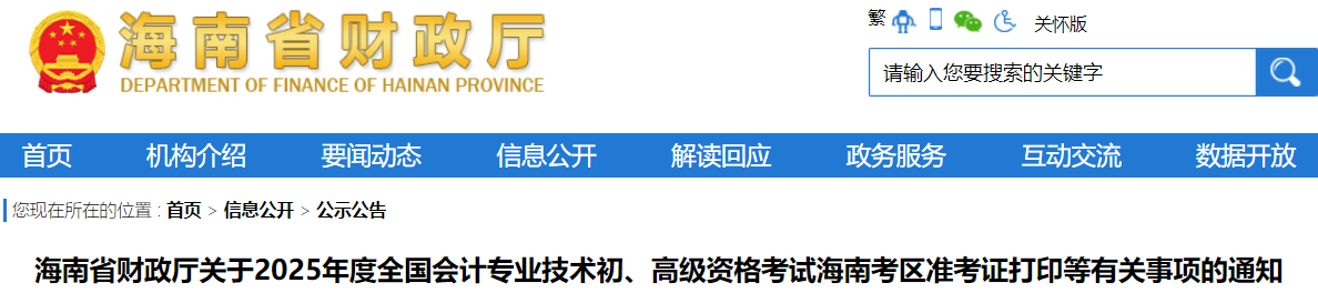 根据财政部、人力资源社会保障部、全国会计专业技术资格考试领导小组办公室《关于2025年度全国会计专业技术资格考试考务日程安排及有关事项的通知》(会考〔2024〕3号)的规定,2025年度全国会计专业技术初级资格考试将于5月17日至18日举行,高级资格考试将于5月17日上午举行。海南考区准考证打印系统开通时间为5月8日至5月17日。现就有关事项通知如下: