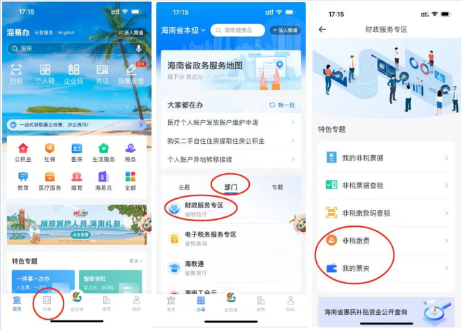下载海易办APP并安装或者使用海易办微信小程序按以下步骤查询票据: